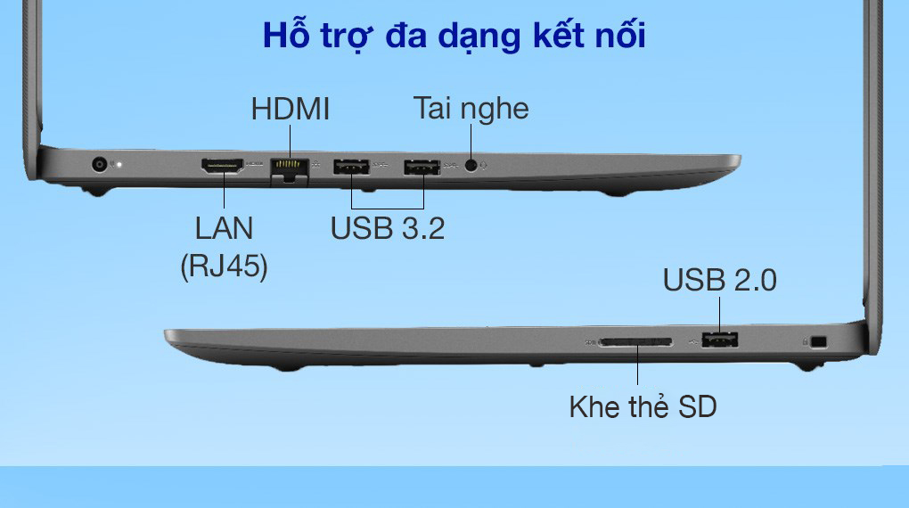 Chiếc laptop Dell này được trang bị đầy đủ các cổng kết nối thông dụng như: Jack tai nghe 3.5 mm, USB 3.2, HDMI, LAN (RJ45), USB 2.0 và khe đọc thẻ nhớ SD tạo môi trường để truyền tải dữ liệu hiệu quả, hỗ trợ công việc của bạn sẽ diễn ra thuận lợi.